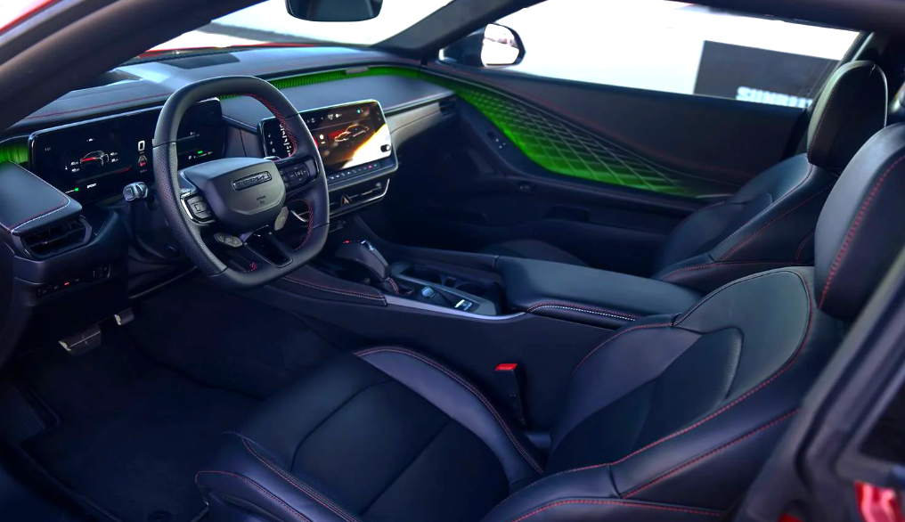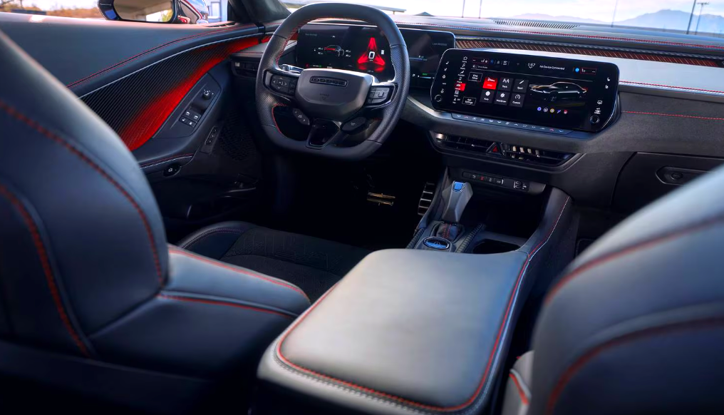 실내는 디지털화가 대폭 진전된 모습입니다. 운전자 중심의 대시보드 구성과 함께 12.3인치 디지털 계기판, 16인치 터치스크린 인포테인먼트, 그리고 앰비언트 라이트까지 구성되어 미래지향적인 분위기를 만끽할 수 있습니다. 무엇보다 닷지가 ‘퍼포먼스 쿠페’라는 정체성을 살리기 위해 버킷 스타일의 스포츠 시트와 전용 스티어링 휠, 시트 벨트 컬러 옵션 등을 제공하고 있어 차량의 감성을 더욱 입체적으로 만들어주고 있습니다. 한편, 뒷좌석은 쿠페 구조상 넓지는 않지만 접이식 설계를 통해 적재 능력까지 배려한 점은 실용성을 고려한 흔적이라 할 수 있습니다.