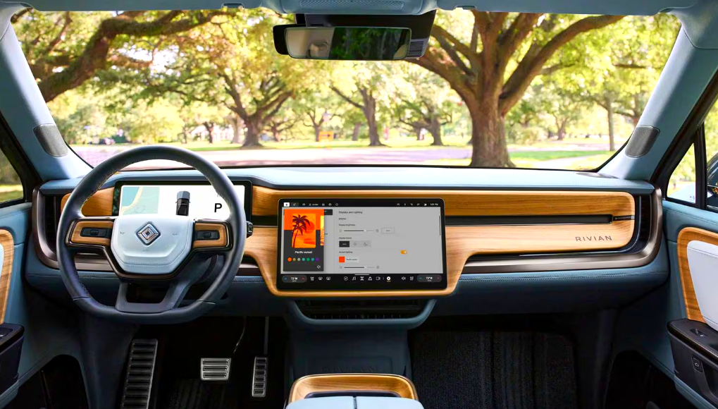 실내는 현대적인 감성과 실용성이 조화를 이루는 공간입니다. 대시보드에는 15.6인치 와이드 디스플레이와 12.3인치 디지털 클러스터가 일체형으로 배치되어 있으며, 리비안 특유의 직관적인 UI 디자인이 돋보입니다. 물리버튼을 최소화하면서도, 터치스크린 내비게이션, 전용 주행모드 설정, 에어컨 컨트롤 등은 한눈에 보기 쉽게 구성되어 있고, 사용자 커스터마이징도 자유로운 편입니다. 고급 우드 트림, 재활용 소재를 활용한 인테리어 마감, 파노라마 글라스 루프, 실내 앰비언트 조명 등 프리미엄 요소도 빠짐없이 탑재되어 있어요.