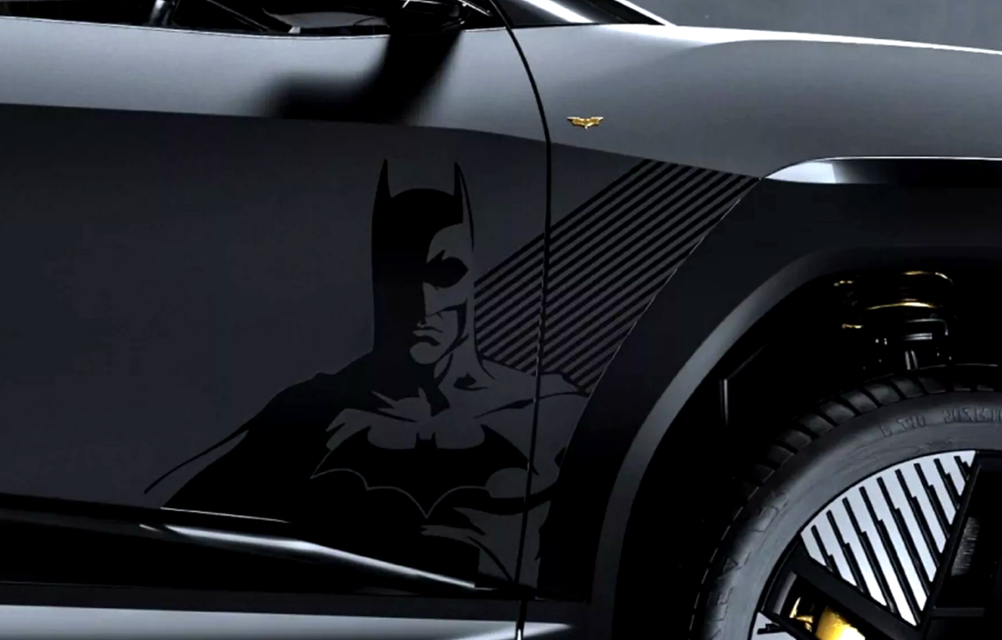 외관을 살펴보면, 전체적으로 스텔스 전투기를 연상시키는 새틴 블랙 차체와 글로스 블랙 포인트가 조화를 이루고 있습니다. 전면 도어에는 배트맨 로고가 크게 부착되어 있고, 전면 펜더에는 금색 박쥐 엠블럼이 자리해 특별판임을 강조합니다. 휠 속에는 골드로 마감된 스프링과 브레이크 캘리퍼가 숨어 있으며, 20인치 알로이 휠과 함께 강렬한 존재감을 발산합니다. 휠 캡, 뒷범퍼, 창문, 후면 유리까지 곳곳에 배트맨 로고가 새겨져 있어 ‘배트모빌’을 연상시키는 디테일이 가득합니다.