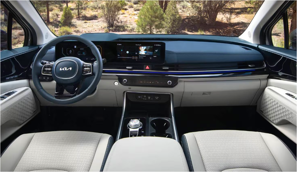 운전석에는 12.3인치 디지털 계기판과 12.3인치 인포테인먼트 디스플레이가 이어지는 와이드 스크린이 자리하고 있고, 새로운 기아 커넥트 시스템이 탑재되어 있습니다.