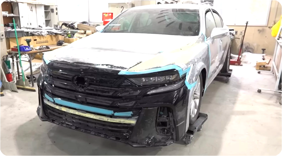 이번 프로젝트는 렉서스 LS460을 베이스로 제작되었습니다. 4.6리터 자연흡기 V8 엔진을 탑재한 플래그십 세단에, 벨파이어 특유의 대형 LED 헤드램프와 공격적인 전면부 디자인을 접목시키면서 전혀 새로운 캐릭터를 완성했습니다. 단순히 범퍼만 교체한 것이 아니라, 헤드램프, 테일램프, 범퍼, 펜더, 사이드 스커트 등 외관 전반에 걸쳐 대대적인 재설계가 이루어졌으며, 차체 비례와 라인을 자연스럽게 다듬어 이질감 없이 조화를 이뤘습니다.